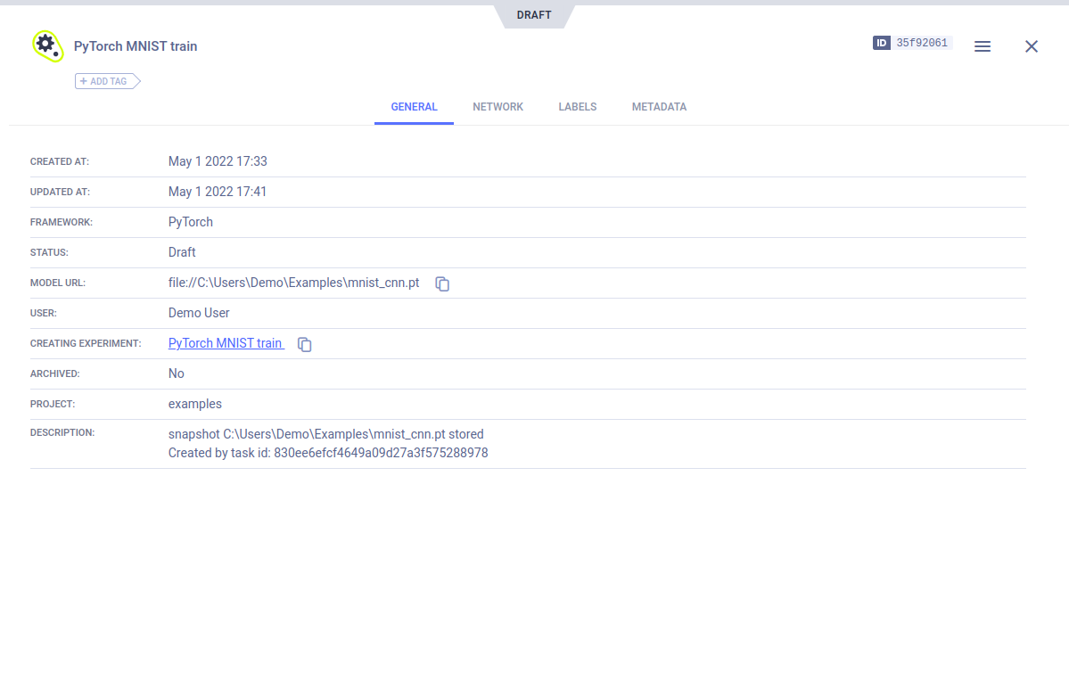 Models created by the experiment appear in the experiment's ARTIFACTS tab. ClearML automatically logs and tracks models and any snapshots created using PyTorch.
