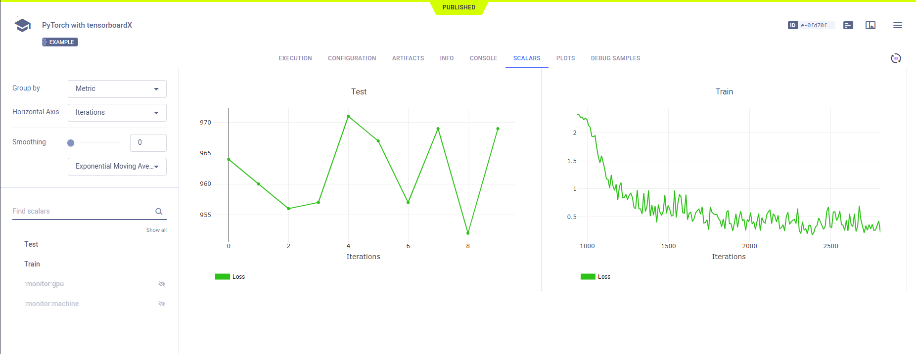 pytorch with tensorboardXin theexamplesproject - ClearML automatically captures scalars and text logged using the TensorBoardX