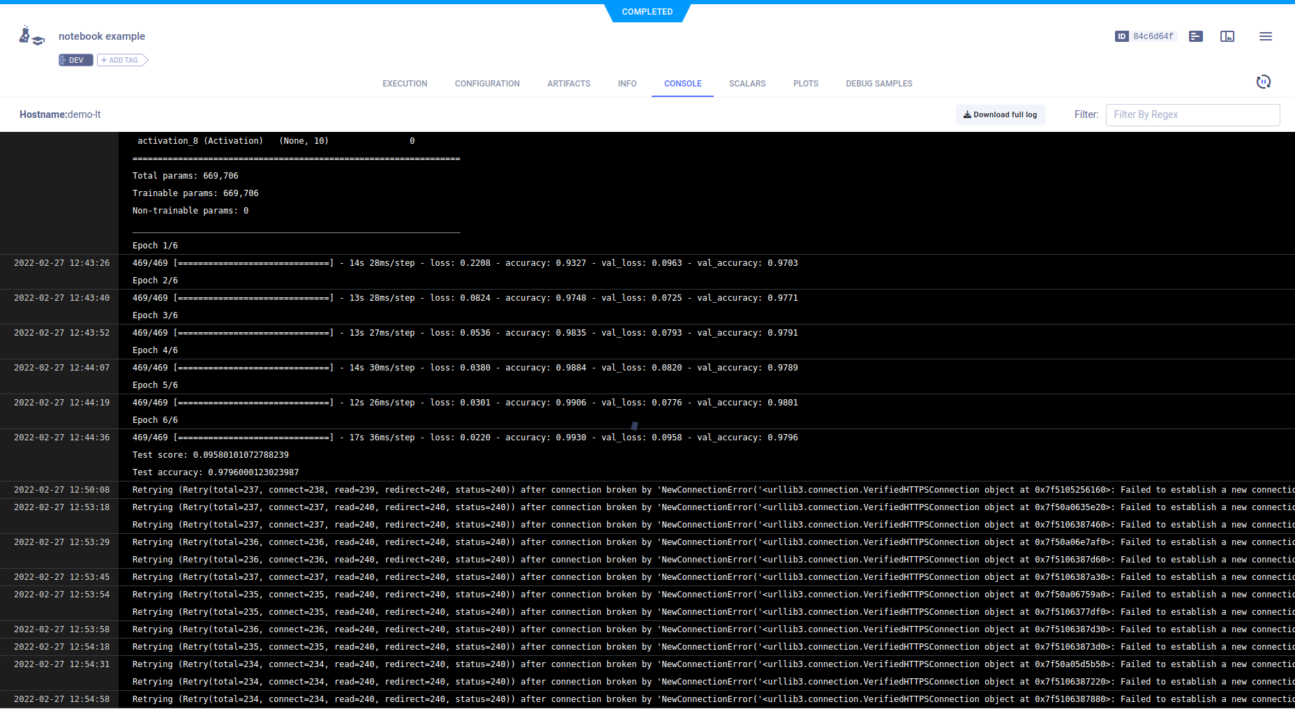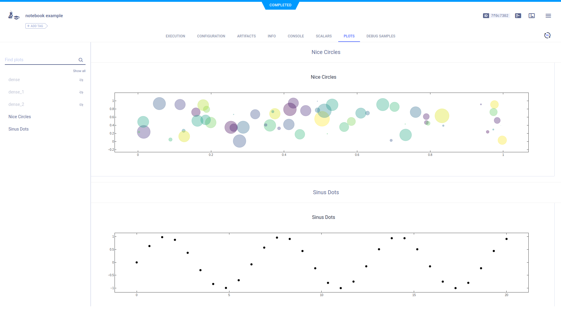 The jupyter.ipynb example demonstrates ClearML's automatic logging of code running in a Jupyter Notebook that uses Keras and Matplotlib.