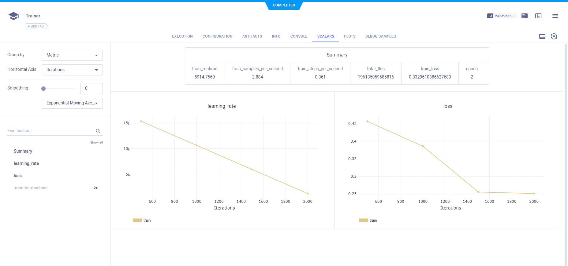 ClearML automatically captures the Trainer's scalars, which can be viewed in the task's Scalars tab.