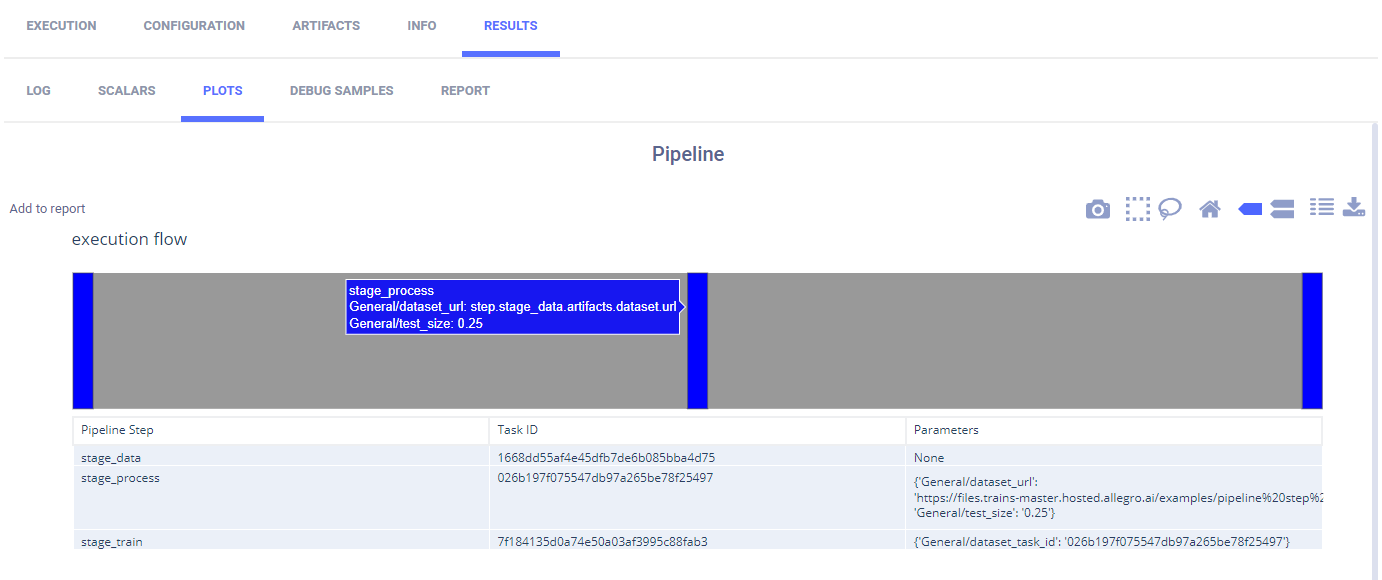 pipe.add_step( name='stage_train', parents=['stage_process', ], base_task_project='examples', base_task_name='pipeline step 3 train model', parameter_override={'General/dataset_task_id': '${stage_process.id}'})name- The name of Step 3 (stage_train).parents- The start of Step 3 (stage_train) depends upon the completion of Step 2 (stage_process).parameter_override- Pass the ID of the Step 2 Task to the Step 3 Task. This is the ID of the cloned Task, not the base Task.