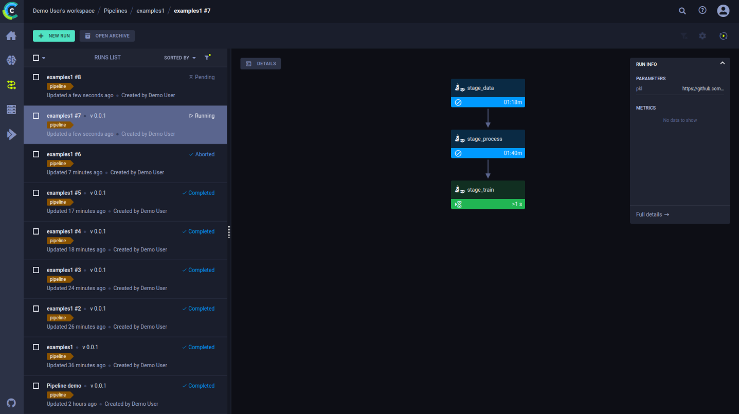 The run details panel shows the pipeline’s structure and the execution status of every step, as well as the run’s configuration parameters and output.
