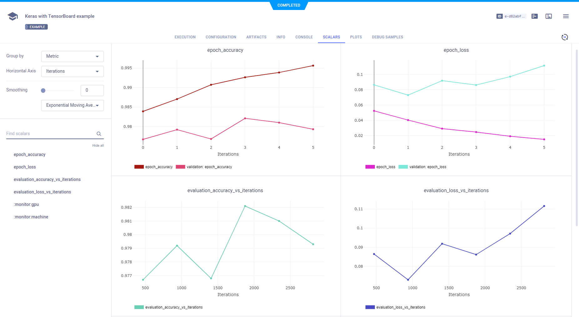 The example below demonstrates the integration of ClearML into code which uses Keras and TensorBoard. View it in script or in Jupyter Notebook.