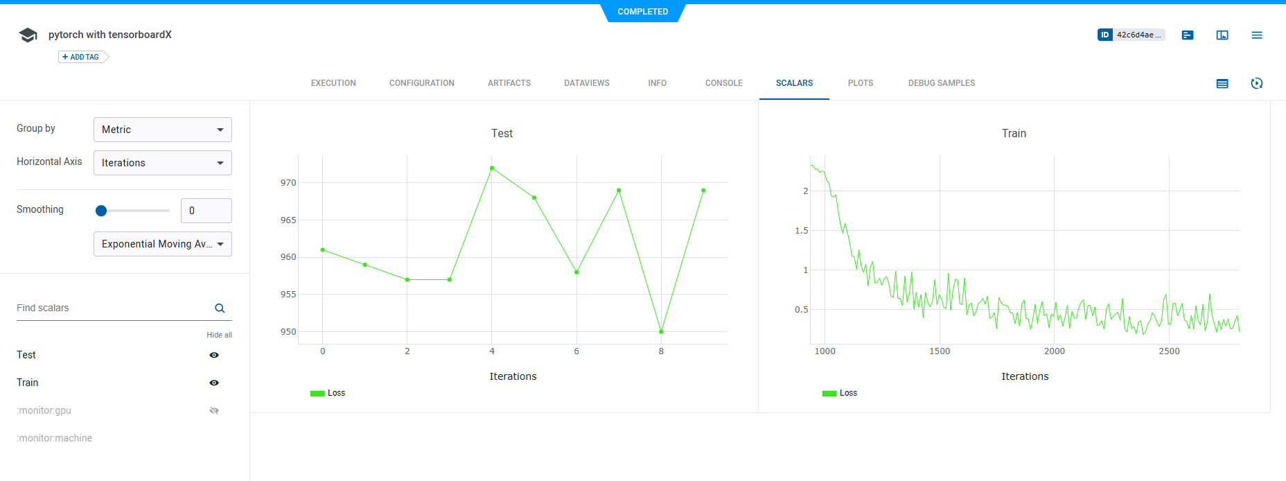 pytorch with tensorboardXin theexamplesproject - ClearML automatically captures scalars and text logged using the TensorBoardX