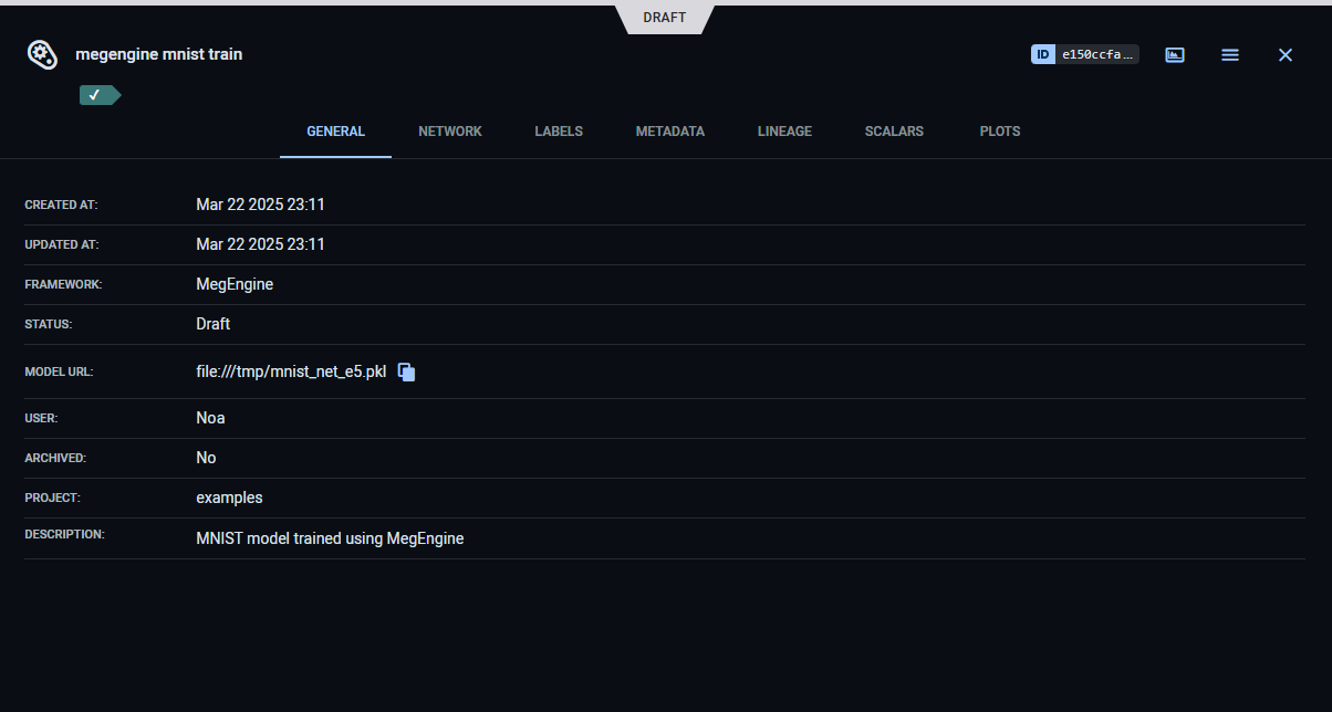 ClearML automatically captures the model logged using the megengine.save method, and saves it as an artifact.