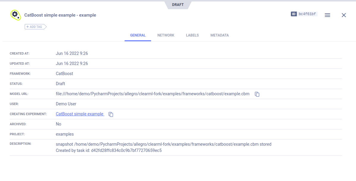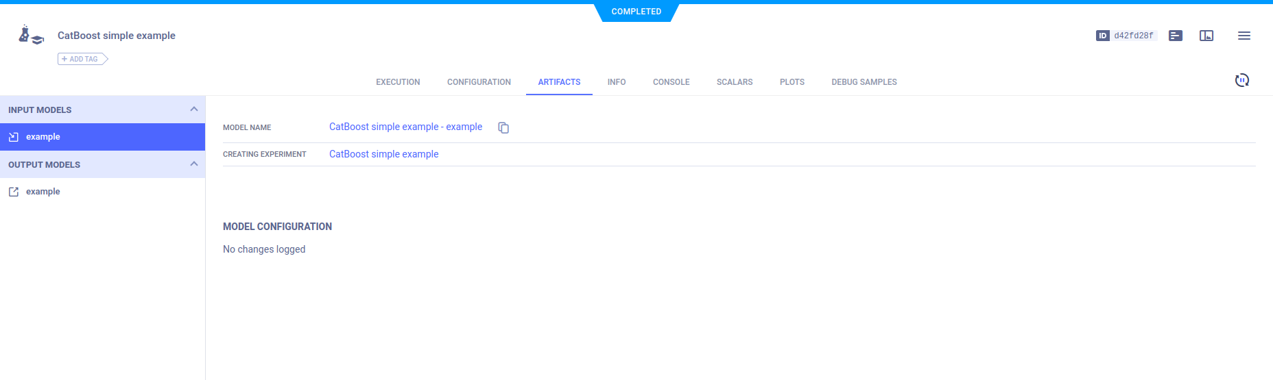 Models created by the experiment appear in the experiment’s ARTIFACTS tab. ClearML automatically logs and tracks models created using CatBoost.