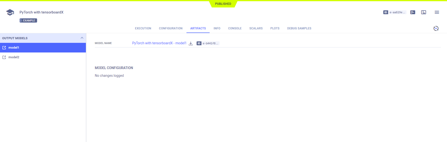 Models created by the experiment appear in the experiment's ARTIFACTS tab. ClearML automatically logs and tracks models and any snapshots created using PyTorch.