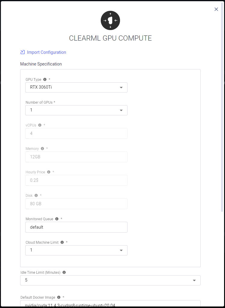 - Default Docker Image - Default Docker image in which the ClearML Agent will run. Provide a Docker stored in a Docker artifactory so instances can automatically fetch it