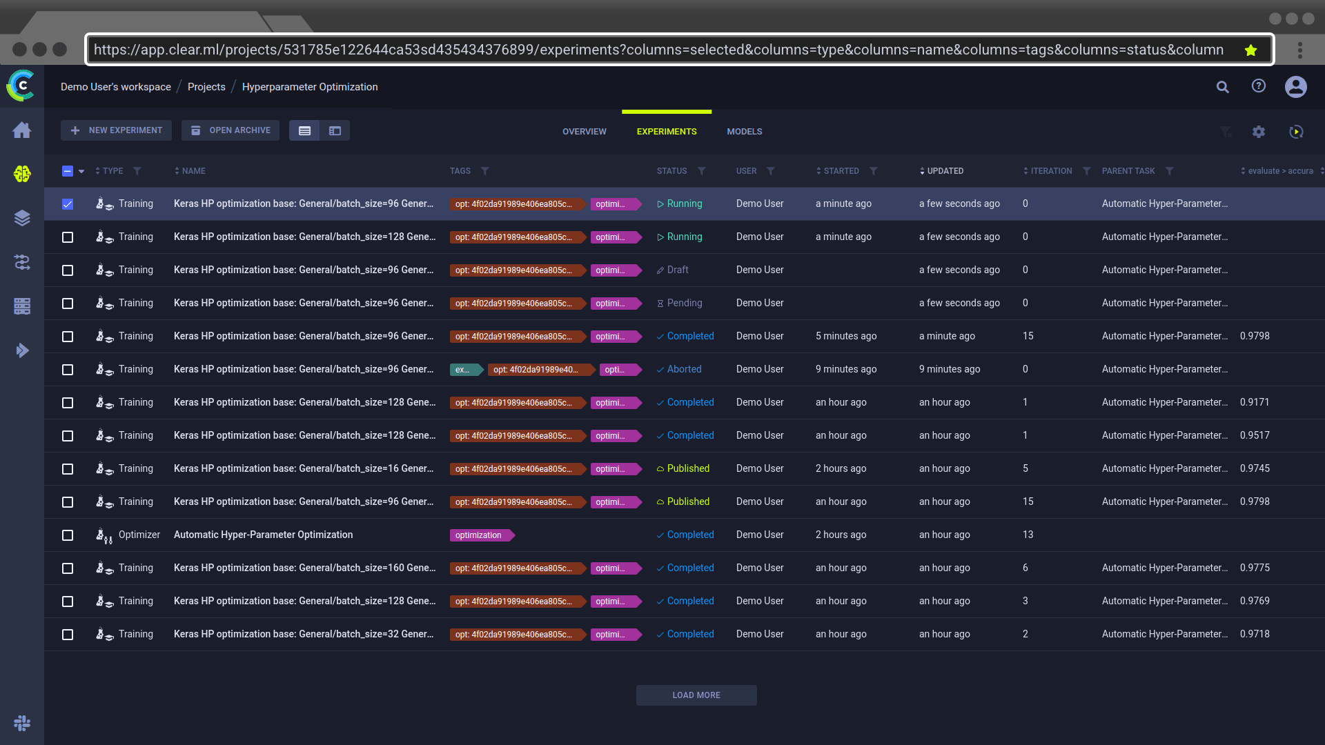 The experiments table is a customizable list of experiments associated with a project. From the experiments table, view experiment details, and work with experiments (reset, clone, enqueue, create tracking leaderboards to monitor experimentation, and more). The experiments table's auto-refresh allows users to continually monitor experiment progress.