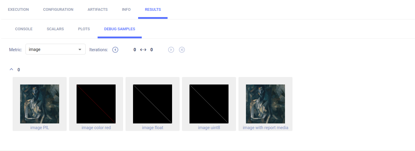 ClearML reports these images as debug samples in the ClearML Web UI > experiment details > RESULTS tab > DEBUG SAMPLES sub-tab.