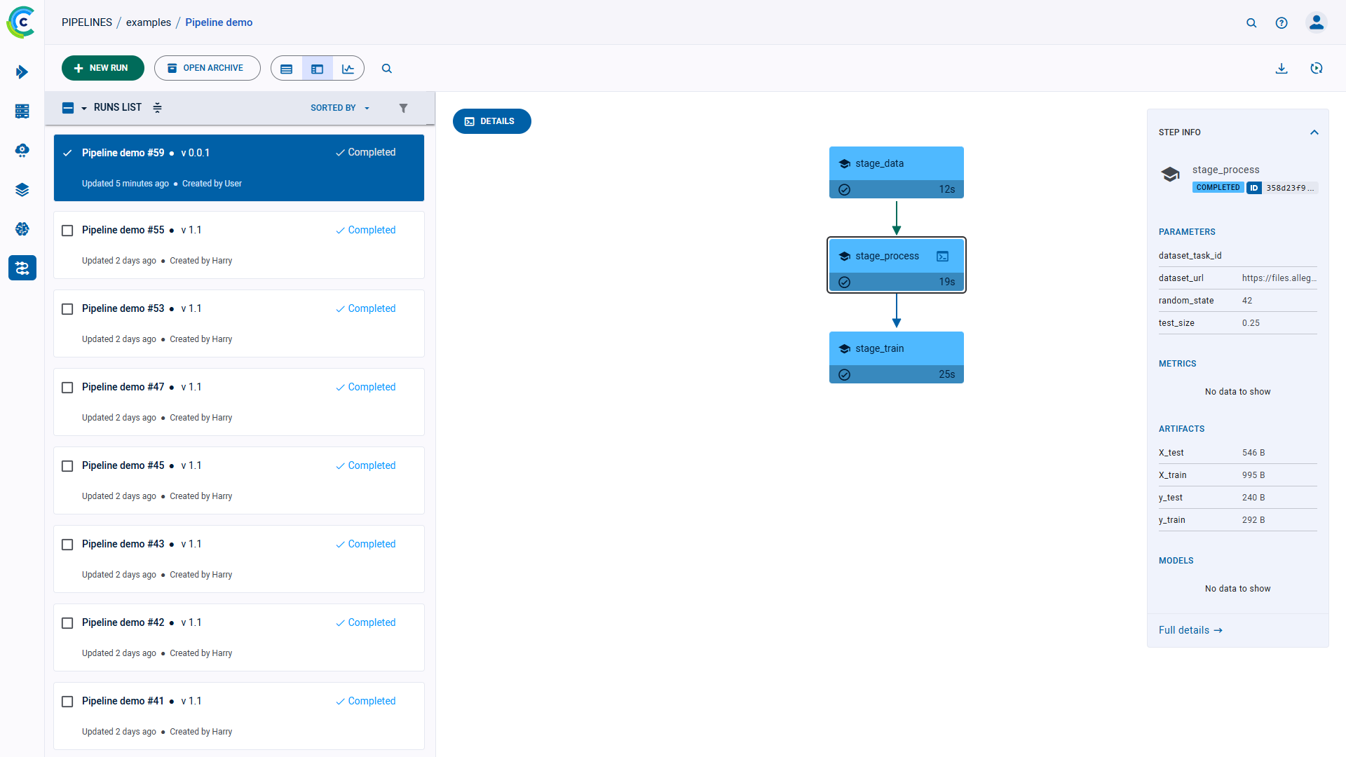 pre_execute_callbackandpost_execute_callbackrespectively.pipe.add_step( name='stage_process', parents=['stage_data', ], base_task_project='examples', base_task_name='pipeline step 2 process dataset', parameter_override={ 'General/dataset_url': '${stage_data.artifacts.dataset.url}', 'General/test_size': 0.25 }, pre_execute_callback=pre_execute_callback_example, post_execute_callback=post_execute_callback_example )The third step uses the pre-existing task