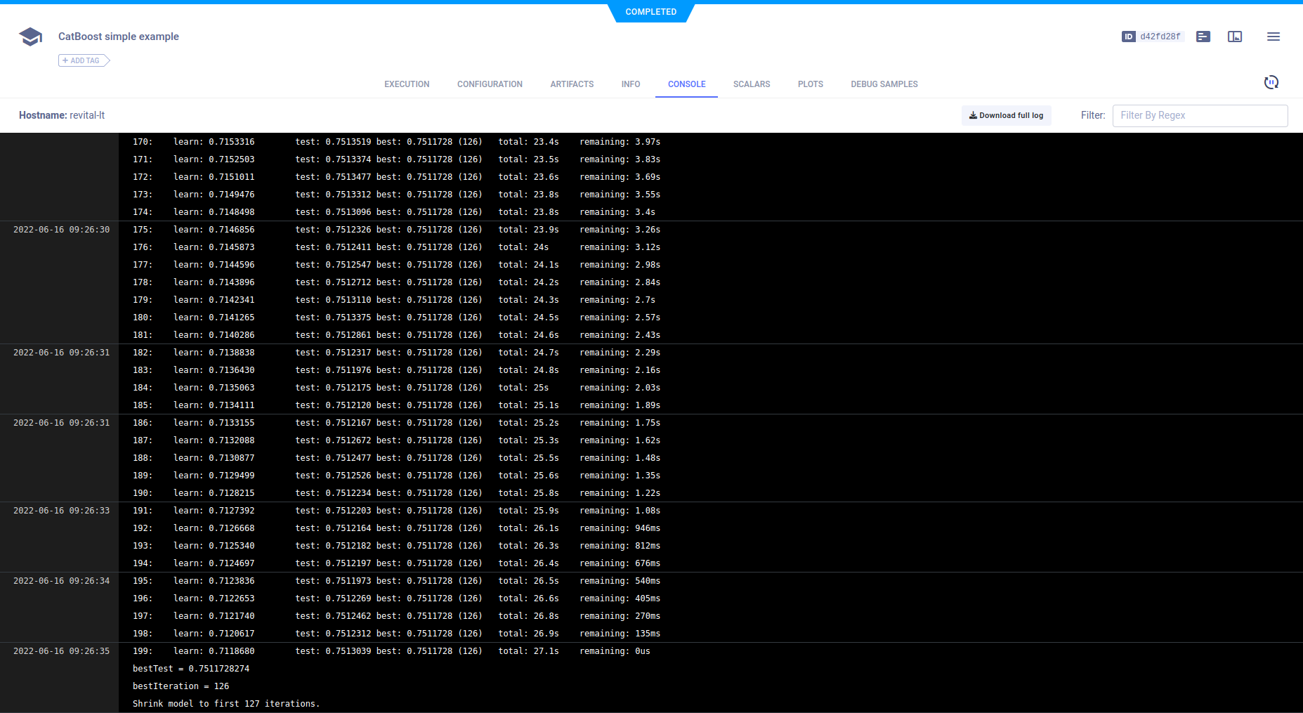 • ClearML automatically logs argparse command line options, and models and metrics logged by CatBoost
