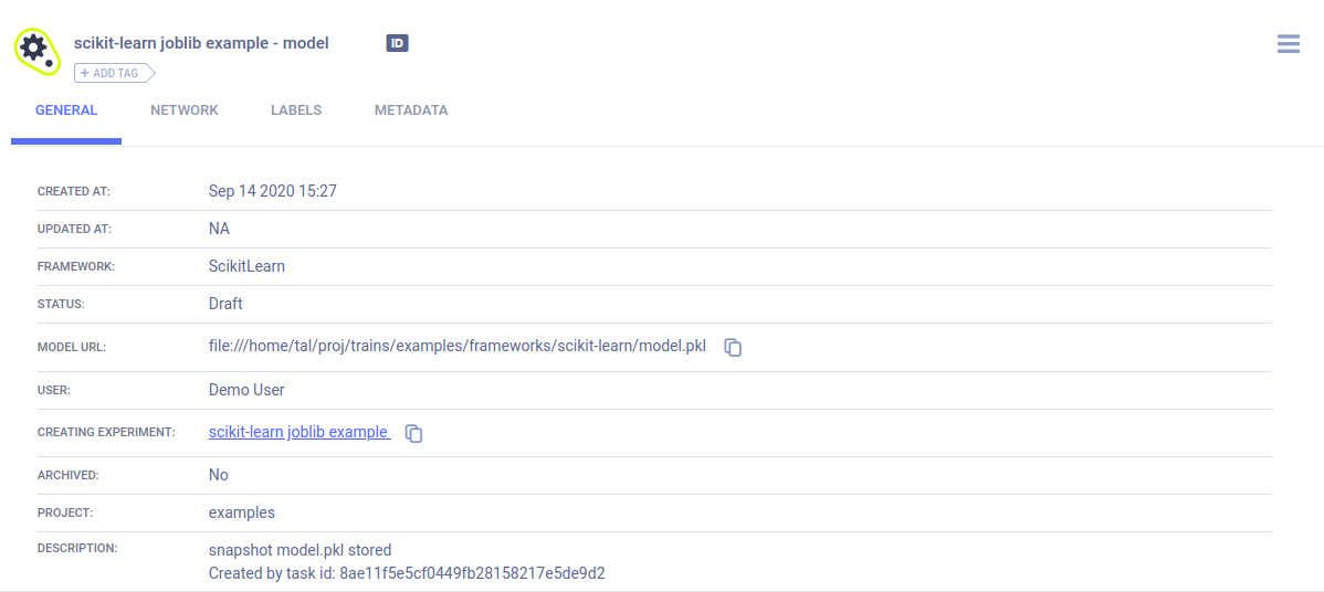 Models created by the experiment appear in the experiment’s ARTIFACTS tab.