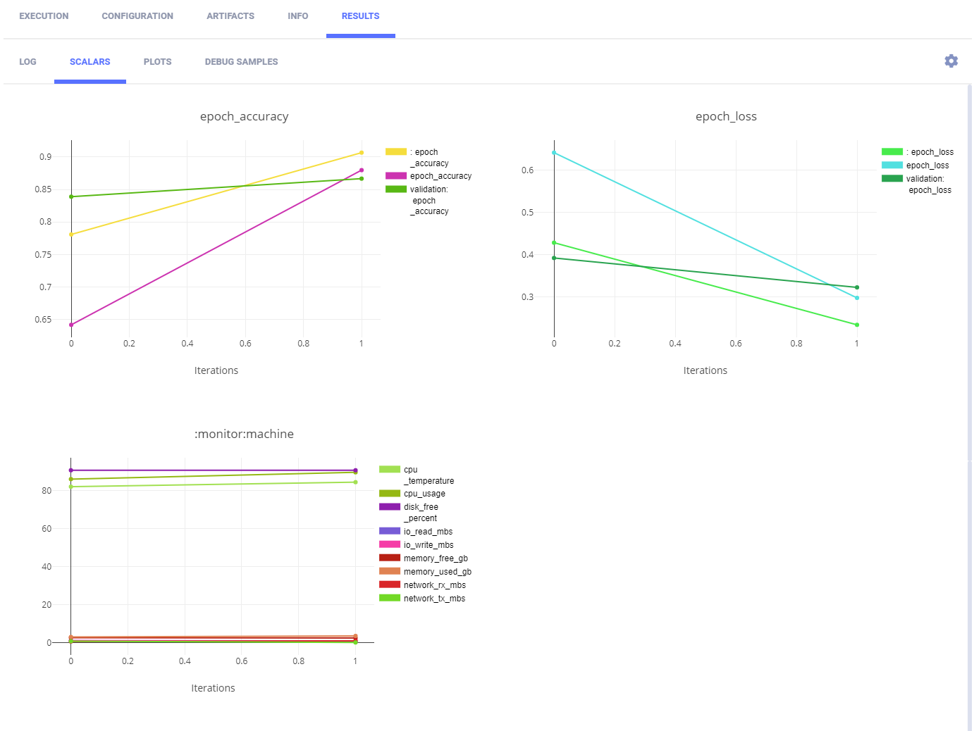 The loss and accuracy metric scalar plots appear in RESULTS > SCALARS, along with the resource utilization plots, which are titled :monitor: machine.