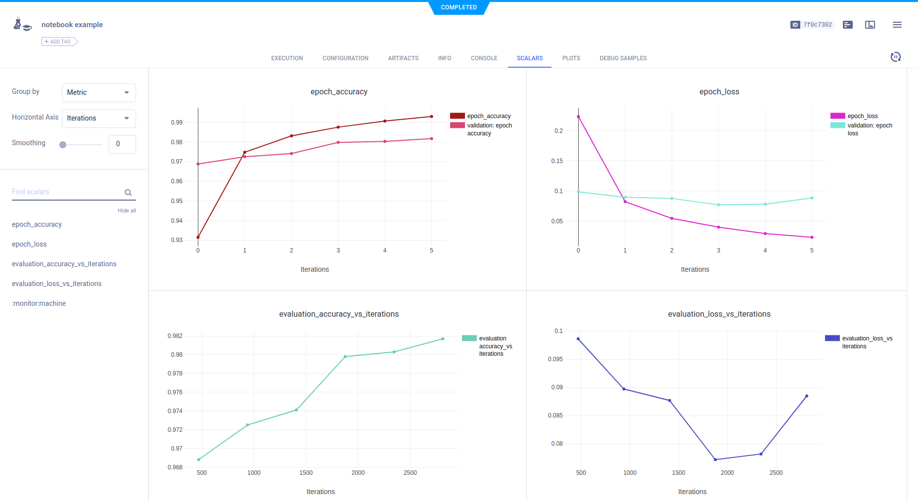 The jupyter.ipynb example demonstrates ClearML's automatic logging of code running in a Jupyter Notebook that uses Keras and Matplotlib.