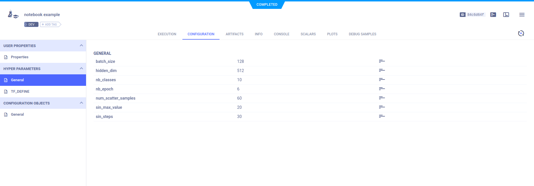 Parameter dictionaries appear in CONFIGURATION > HYPERPARAMETERS > General.
