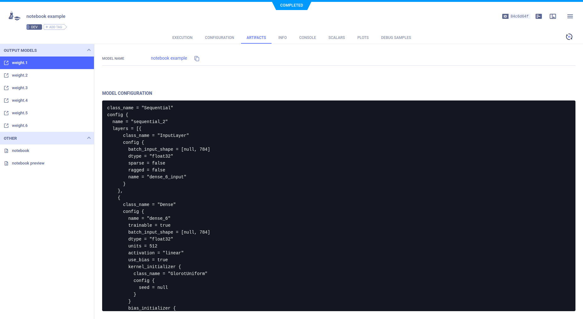 Model artifacts associated with the experiment appear in the experiment info panel (in the EXPERIMENTS tab), and in the model info panel (in the MODELS tab).