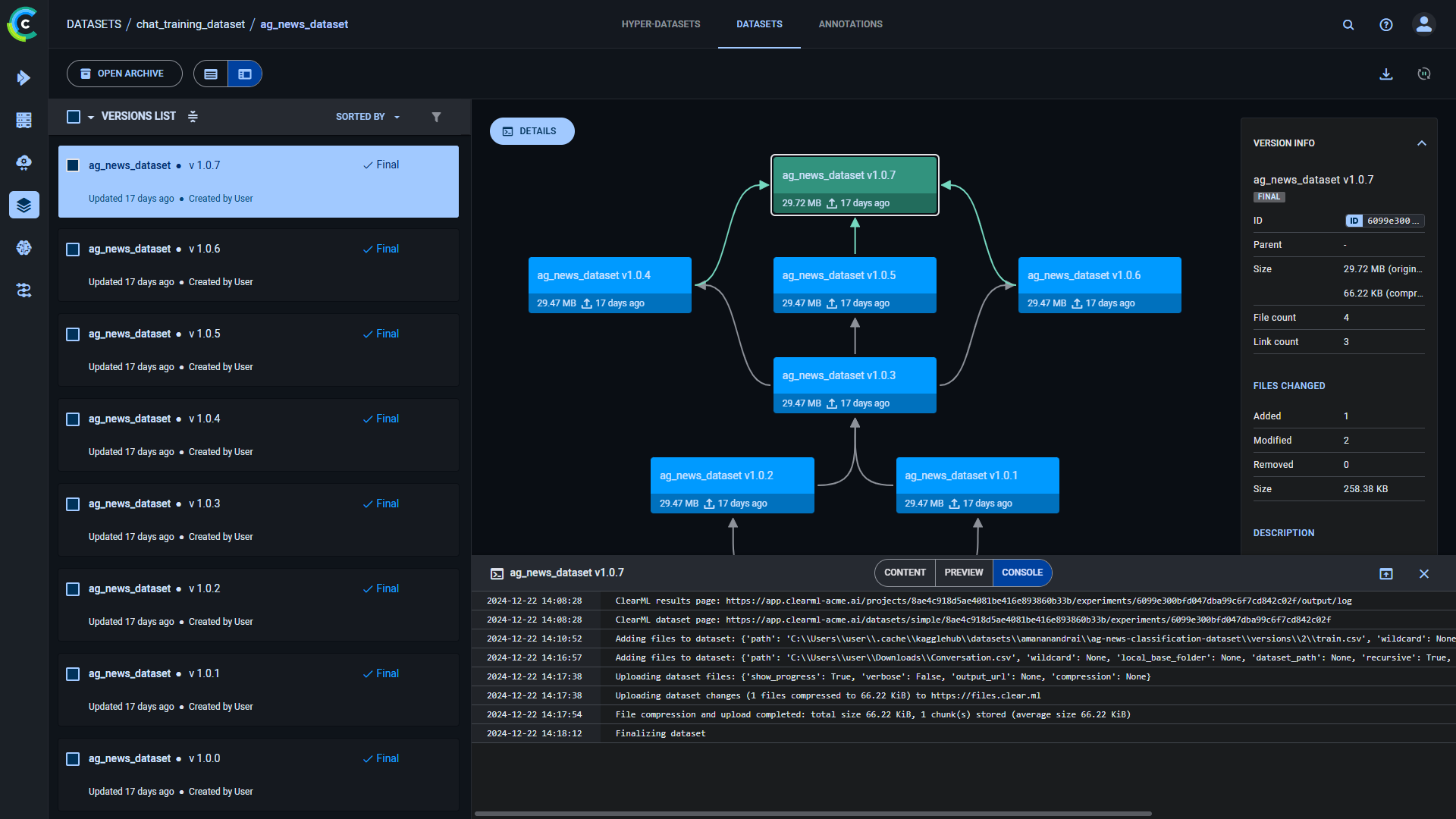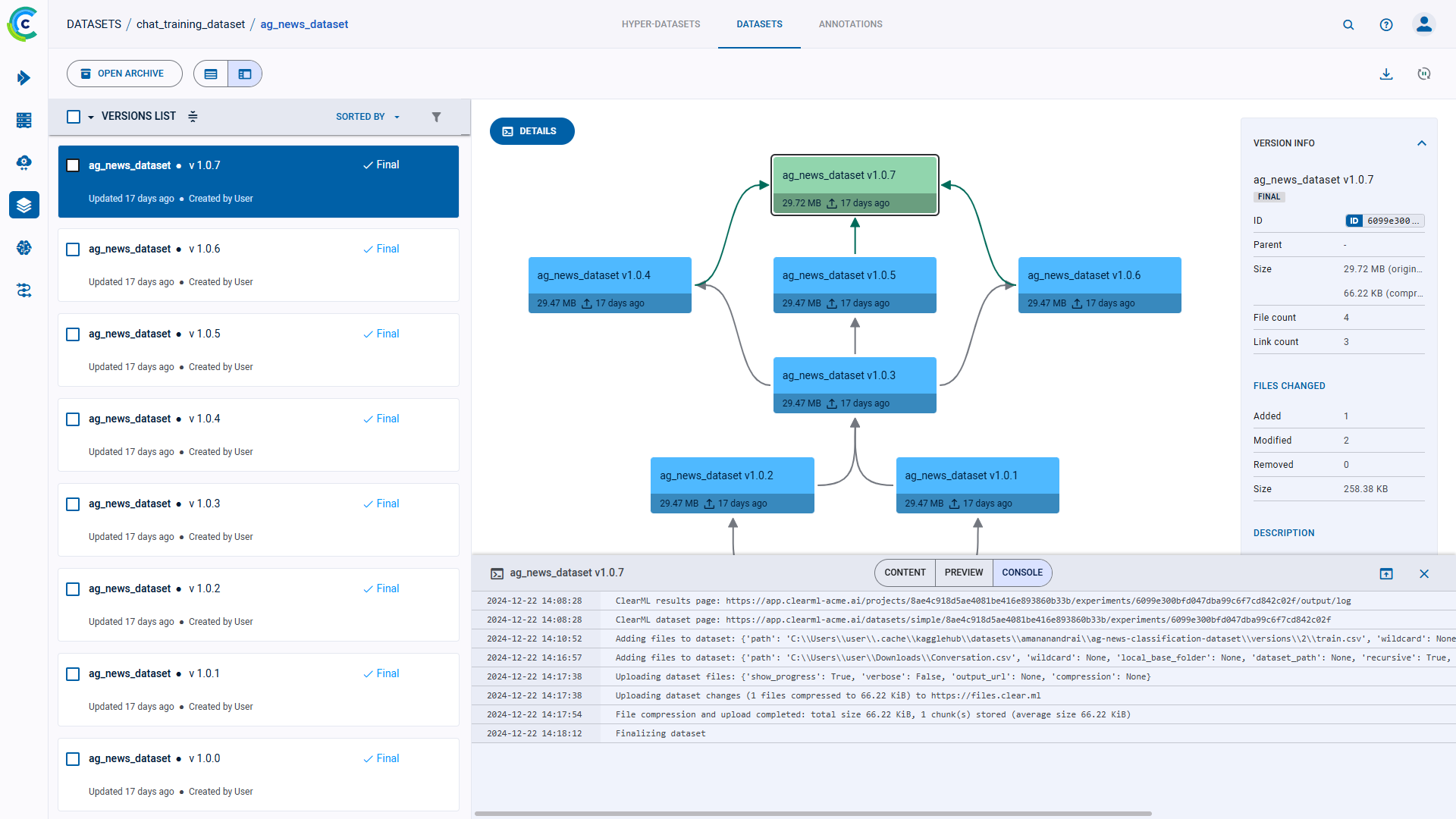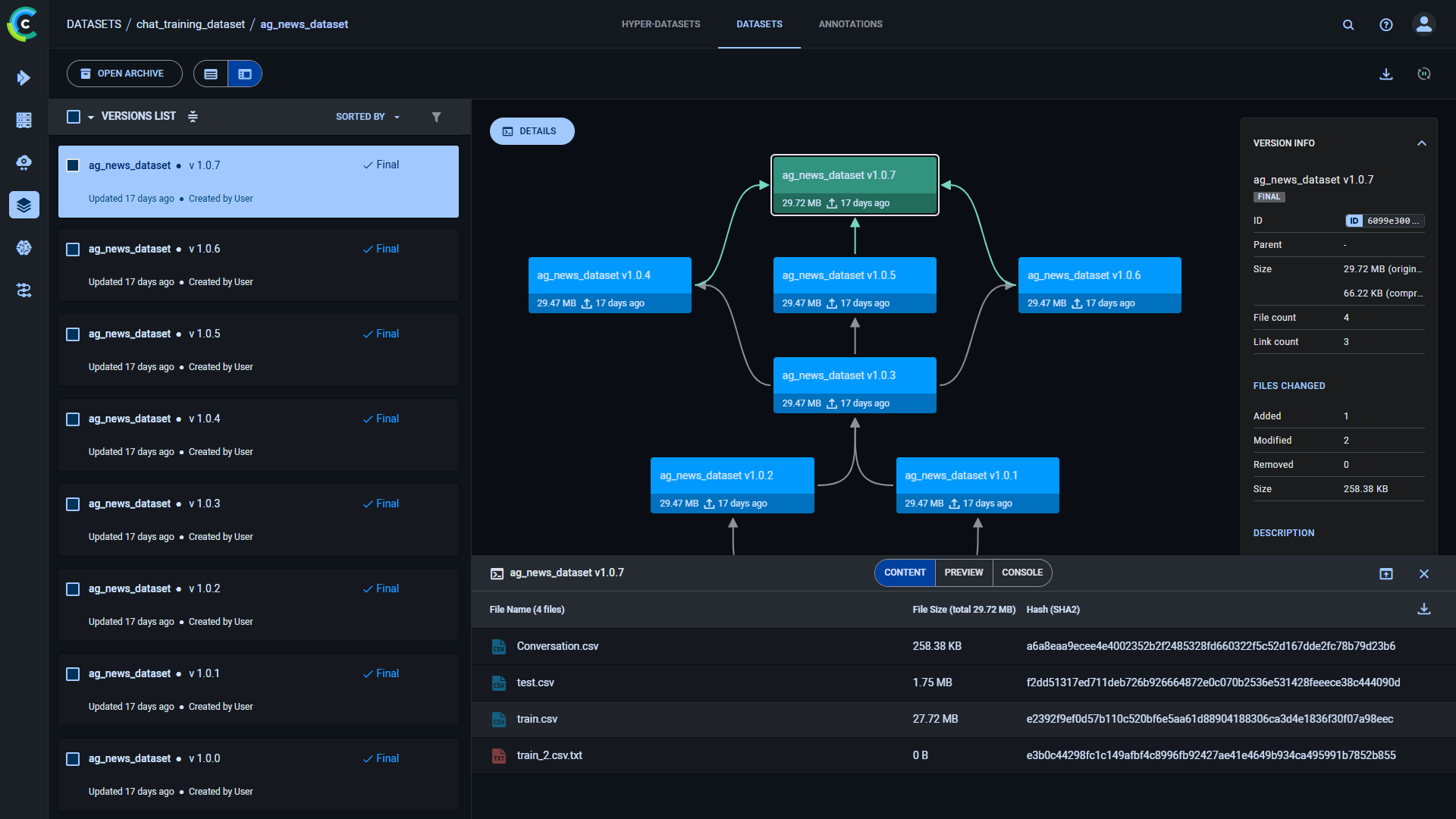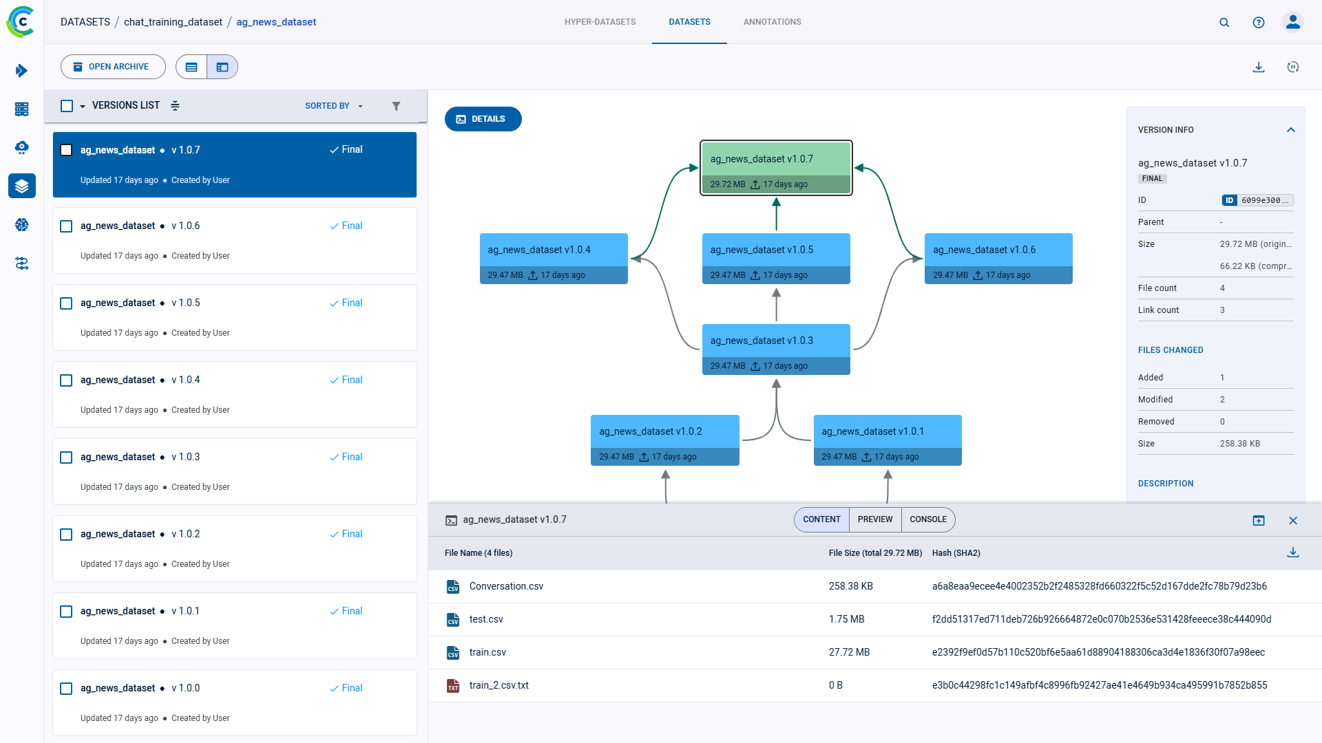 The dataset page lists the dataset's versions. For a selected version, the Dataset Version Panel shows its lineage in graph form.