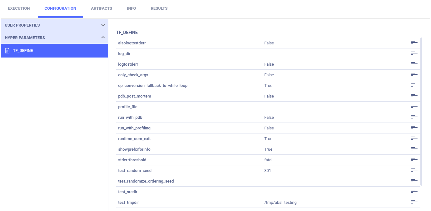 ClearML automatically logs TensorFlow Definitions. They appear in CONFIGURATIONS > HYPER PARAMETERS > TF_DEFINE.