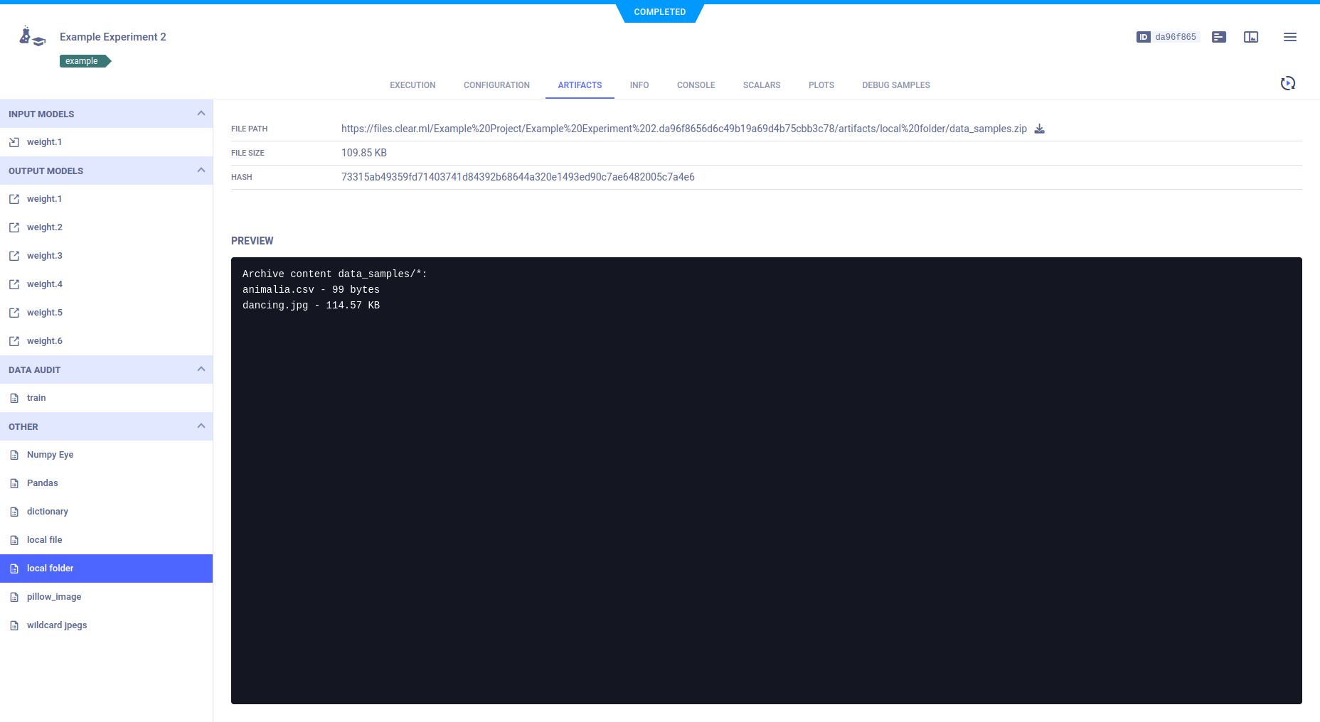 Artifacts tracked in an experiment appear in the ARTIFACTS tab, and include models and other artifacts.