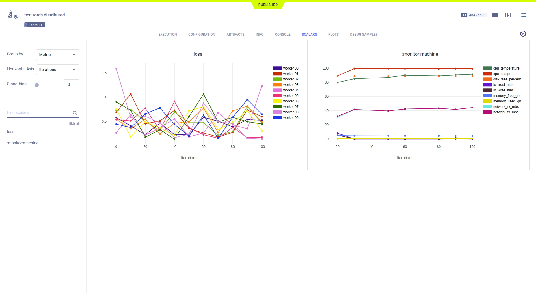 All scalars that ClearML automatically logs, as well as those explicitly reported in code, appear in