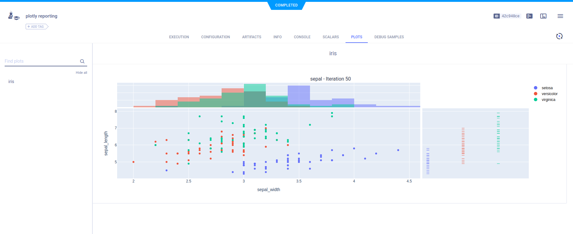 - Plots - Other plots and data, for example: Matplotlib, Plotly, and ClearML explicit reporting.