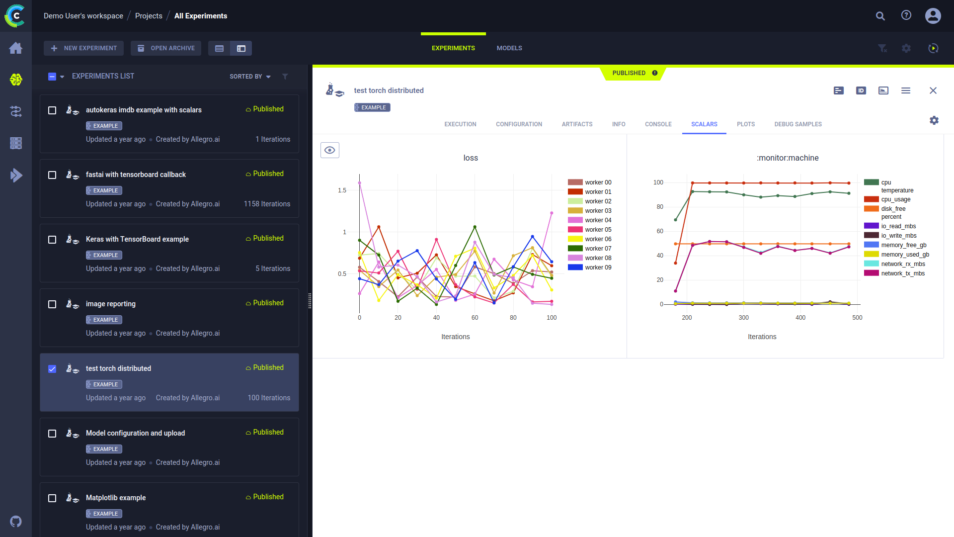 While an experiment is running, and any time after it finishes, track it and visualize the results in the ClearML Web UI, including: