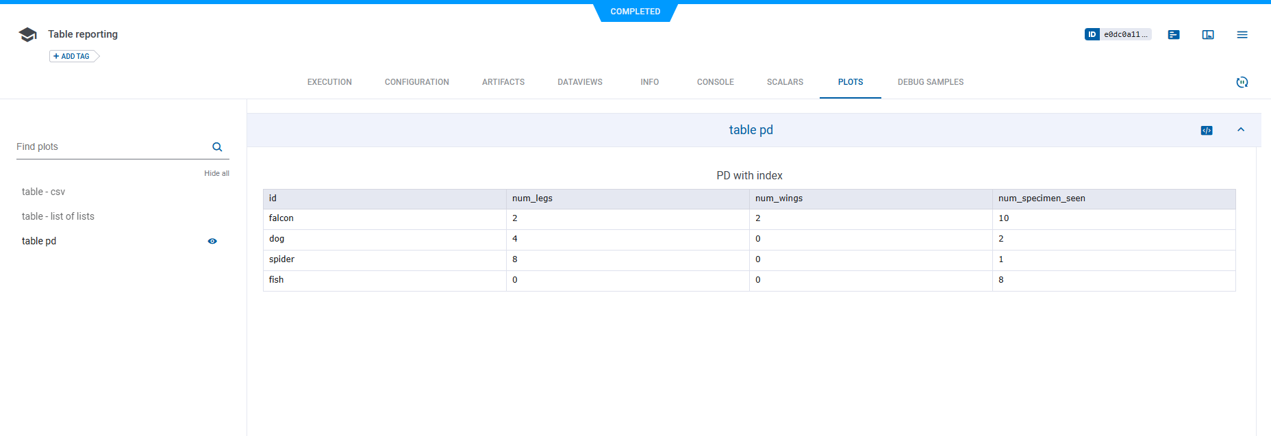 ClearML reports these tables, and displays them in the ClearML Web UI > task's PLOTS tab.