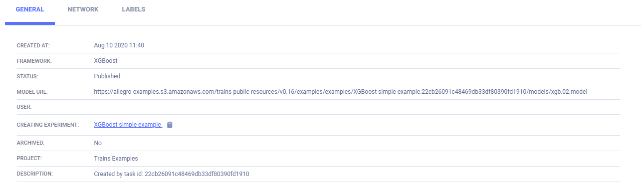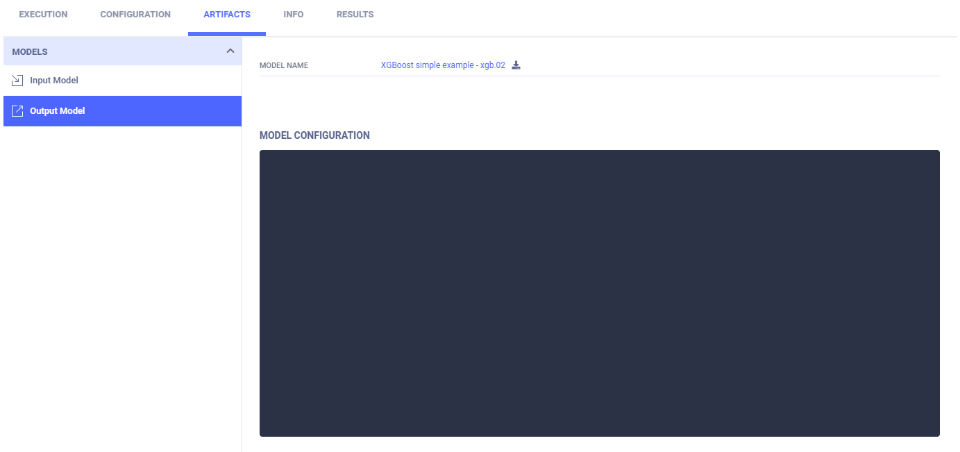 Model artifacts associated with the experiment appear in the info panel of the EXPERIMENTS tab and in the info panel of the MODELS tab.