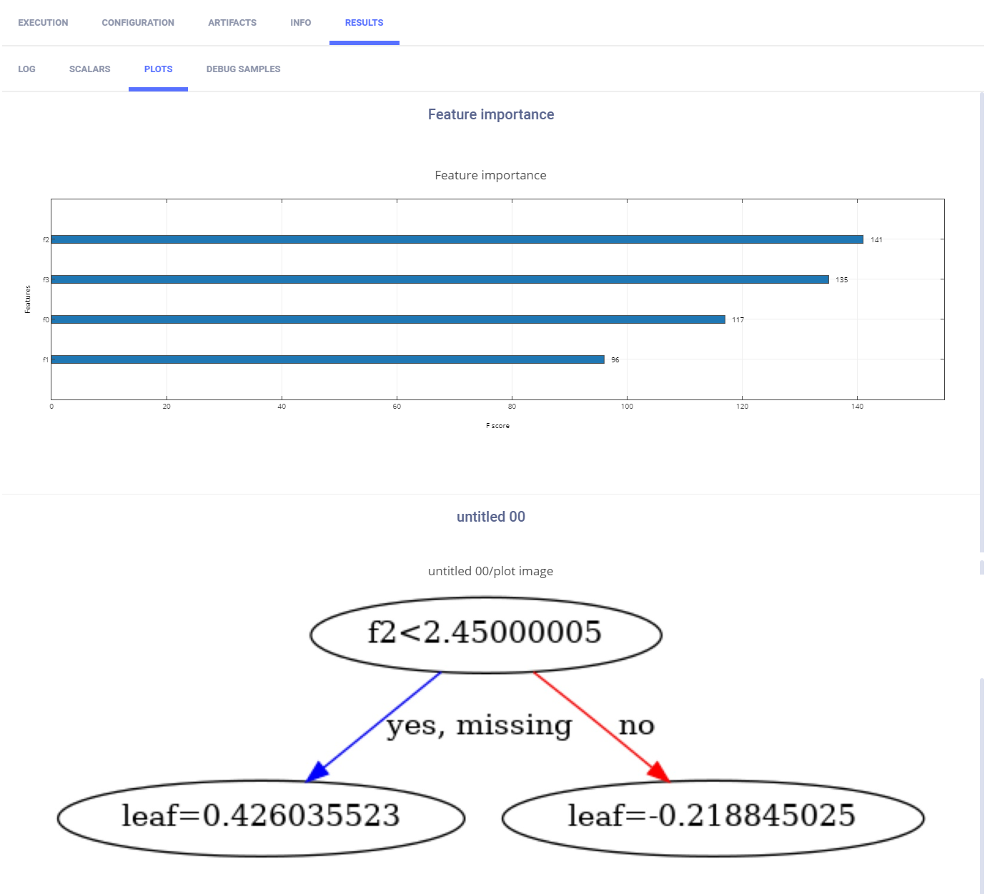 The feature importance plot and tree plot appear in the project's page in the ClearML web UI, under RESULTS > PLOTS.