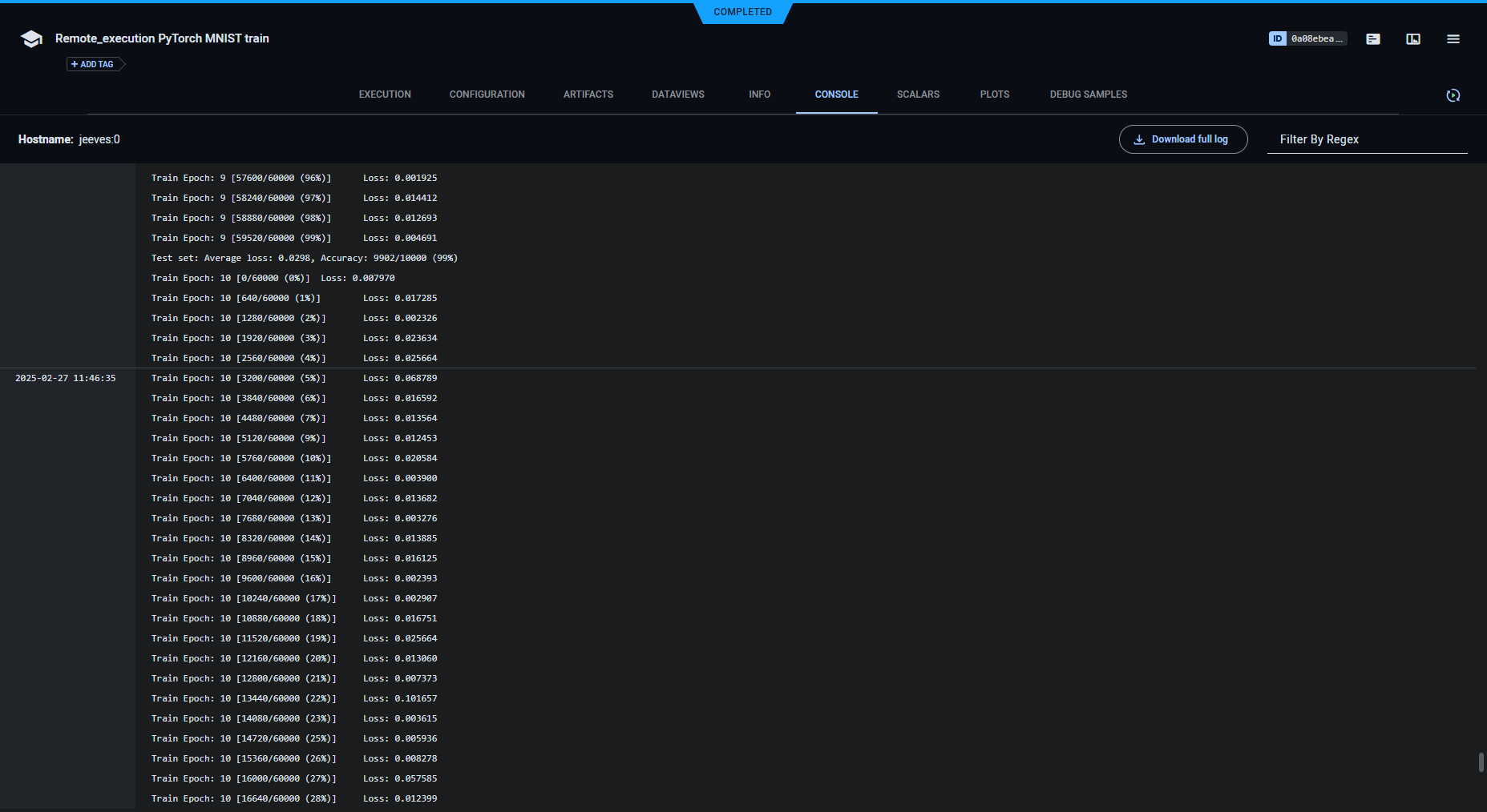 pytorch mnist trainin theexamplesproject. - ClearML automatically logs