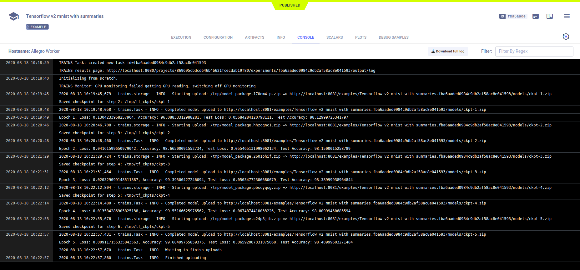 The tensorflow_mnist.py example demonstrates the integration of ClearML into code that uses TensorFlow and Keras to train a neural network on the Keras built-in MNIST handwritten digits dataset.