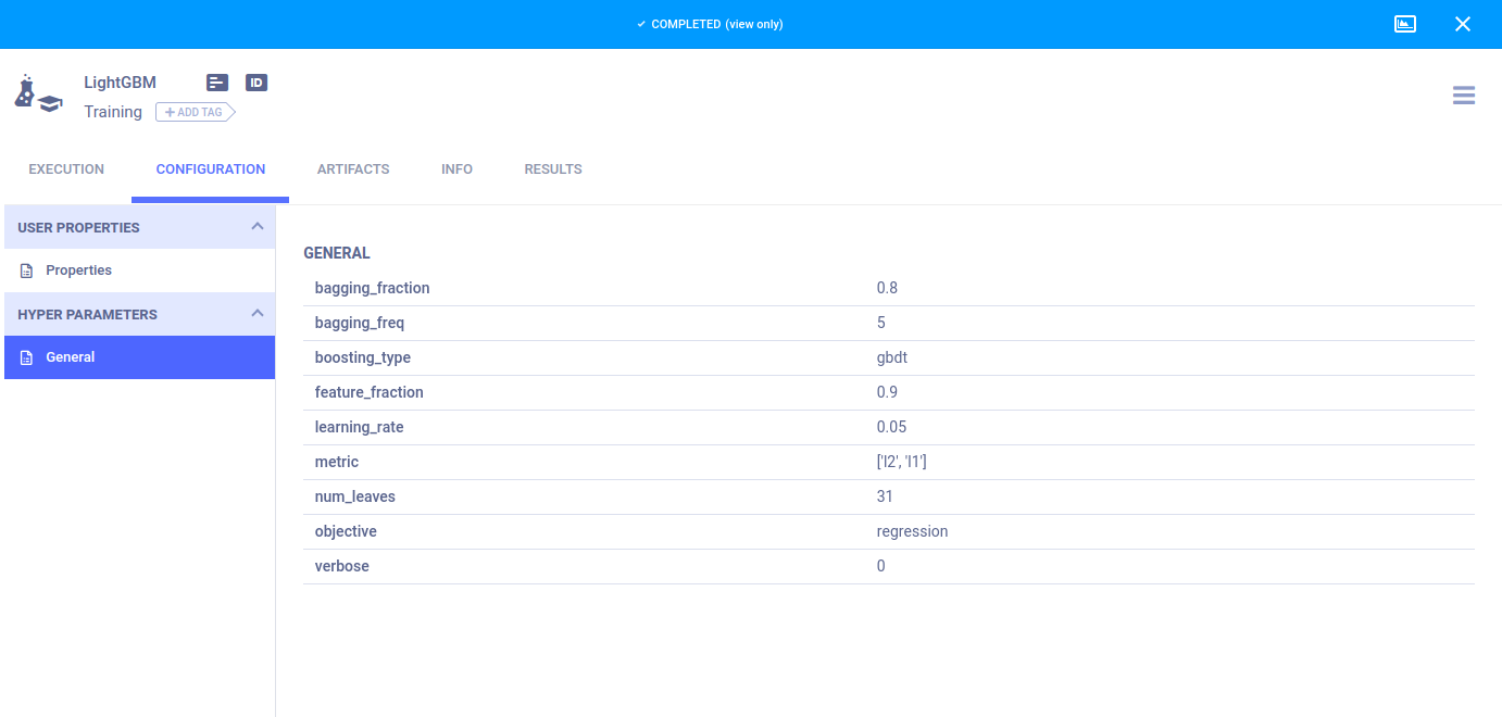 ClearML automatically logs the configurations applied to LightGBM. They appear in CONFIGURATIONS > HYPER PARAMETERS > GENERAL.