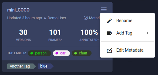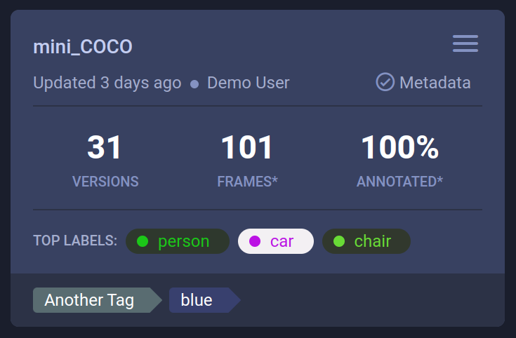 - The percentage of frames annotated in all versions of the Dataset. If an asterisk (*) appears next to ANNOTATED, then you can hover over it and see the name of the version whose frames were last annotated
