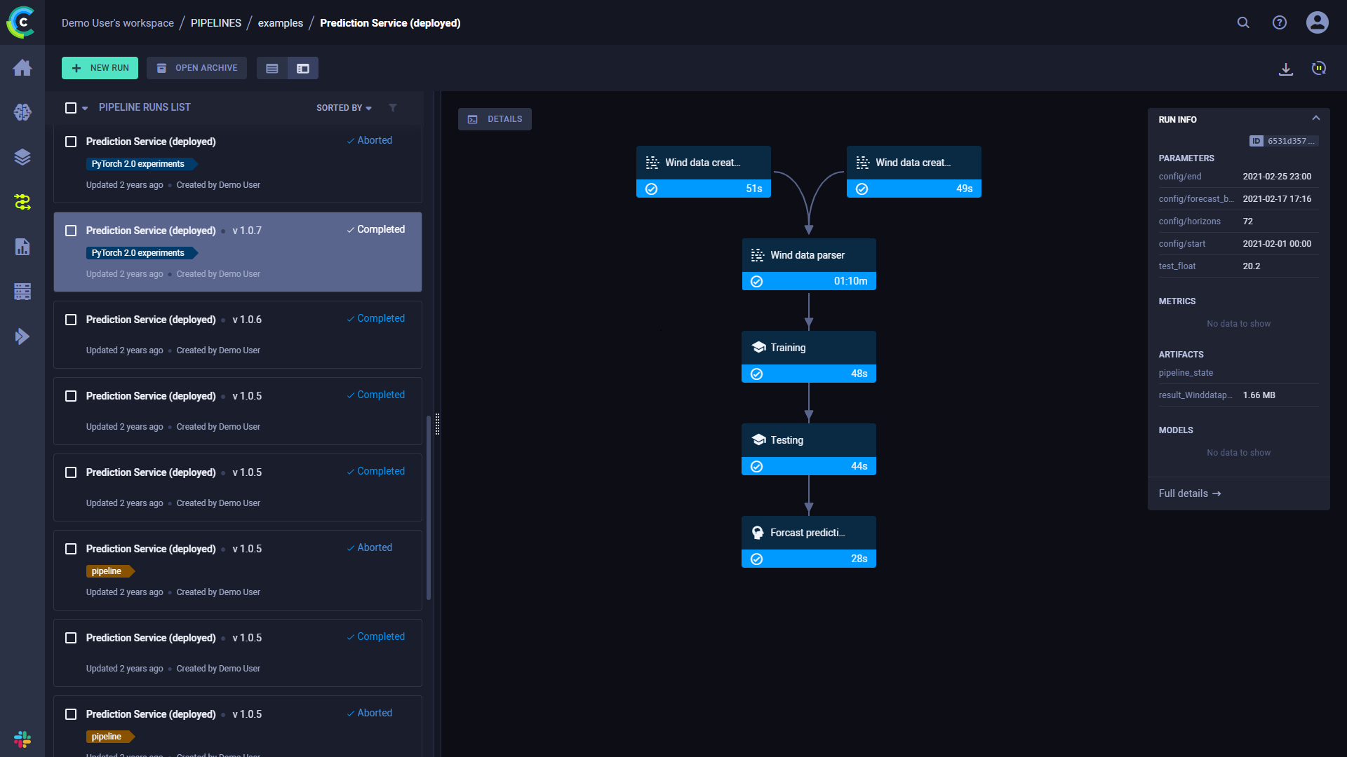 The run details panel shows the pipeline's structure and the execution status of every step, as well as the run's configuration parameters and output.