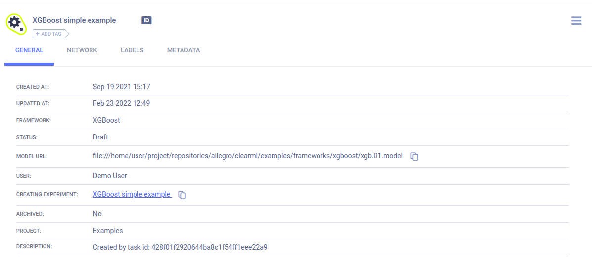 Models created by the experiment appear in the experiment’s ARTIFACTS tab. ClearML automatically logs and tracks models and any snapshots created using XGBoost.