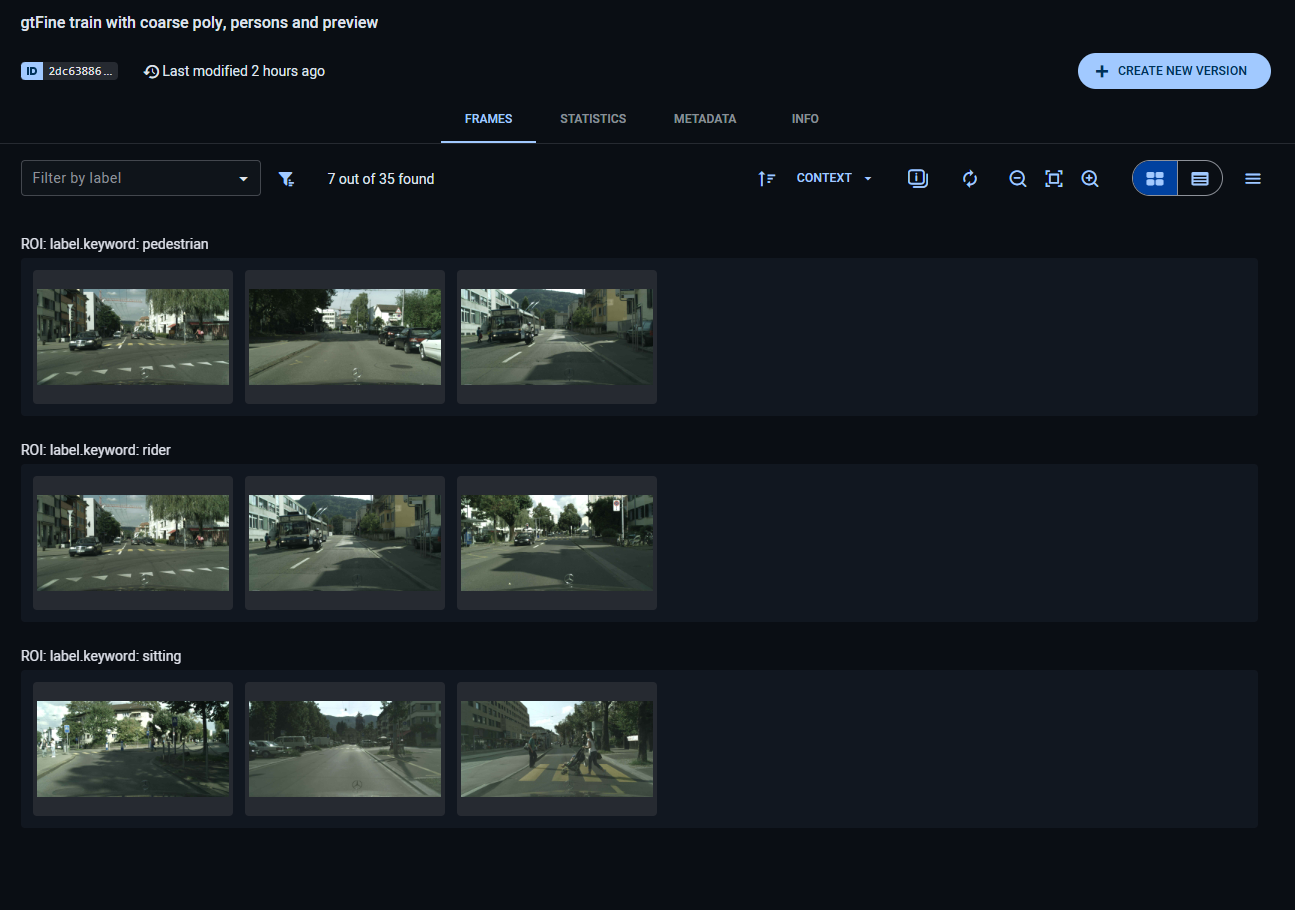 The Frames tab displays the contents of the selected dataset version.