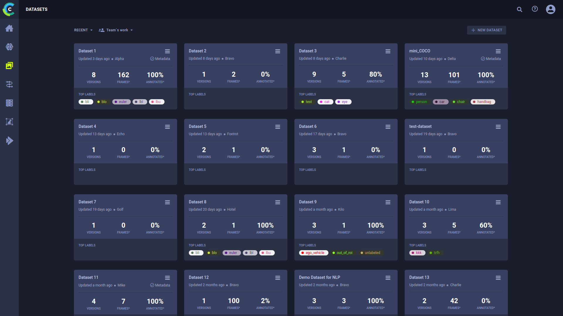 Dataset cards show summary information about versions, frames, and labels in a Dataset, and the elapsed time since the Dataset was last update and the user doing the update. Dataset cards allow you to open a specific Dataset to perform Dataset versioning and frames management.