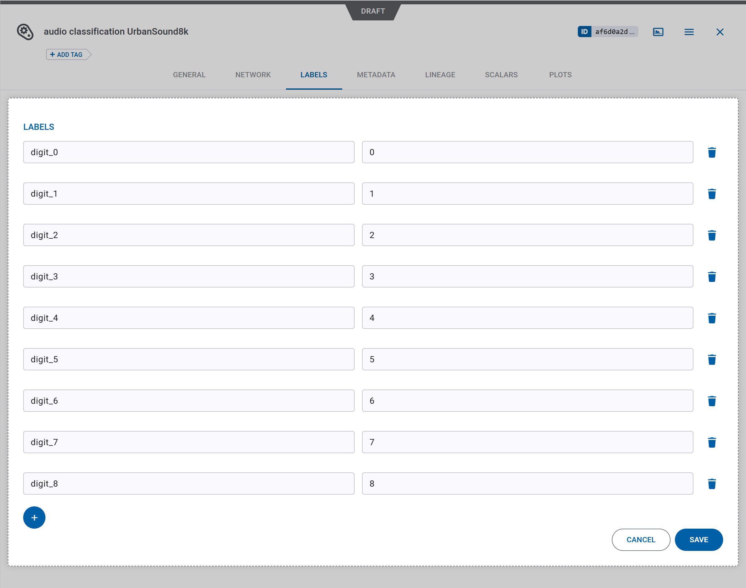 The LABELS tab displays for each class label (Label) its name and enumerated value (ID).