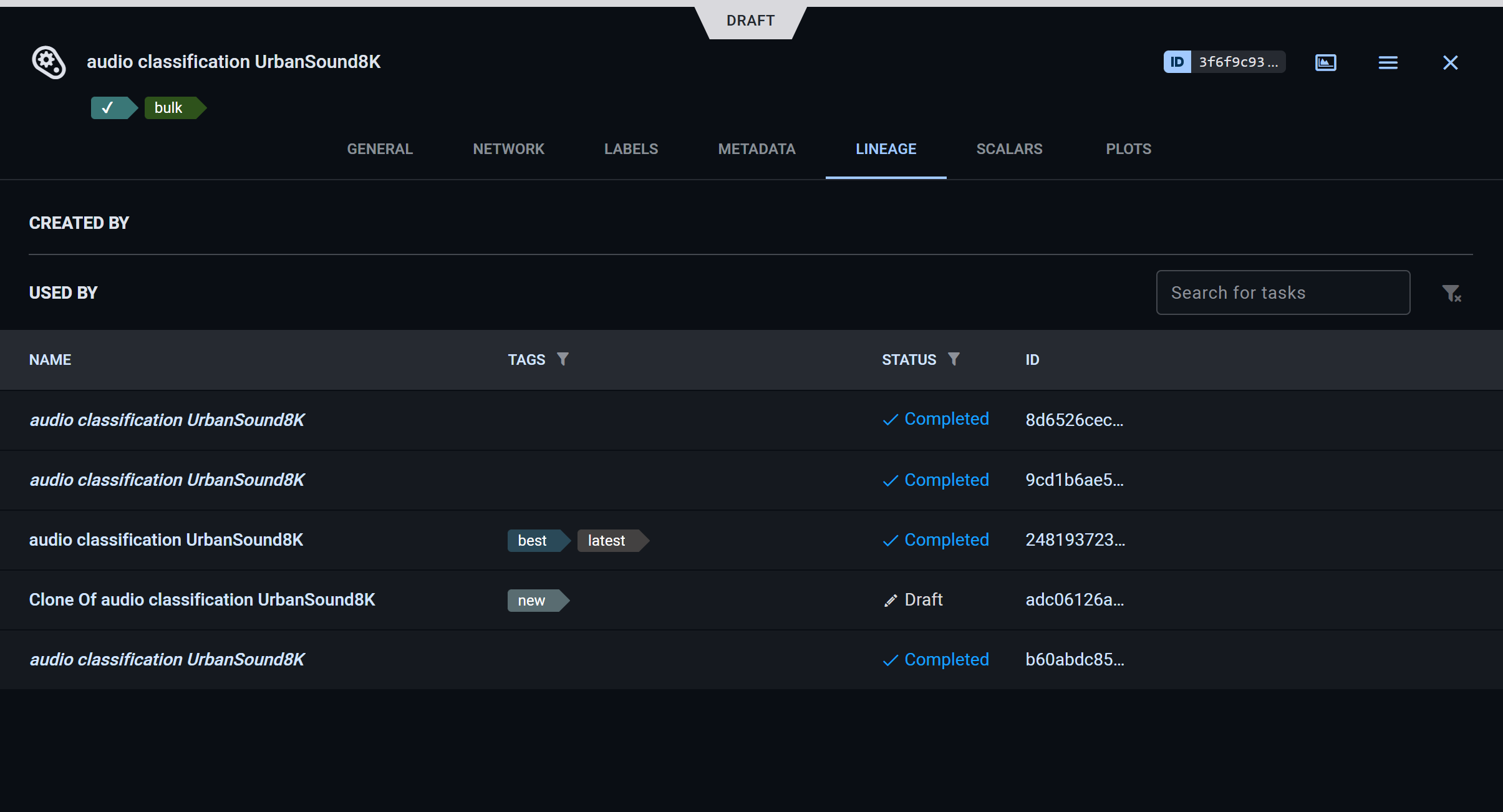 The LINEAGE tab displays the model's creating task (the ClearML task that generated the model) and lists all the tasks where the model is used as an input model. Click a task to navigate to its page.