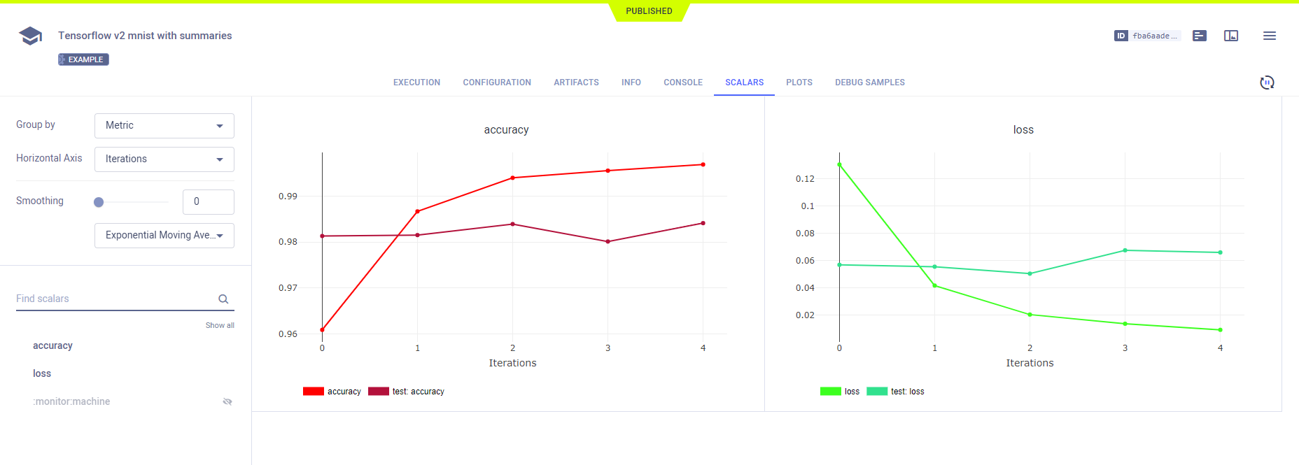 The tensorflow_mnist.py example demonstrates the integration of ClearML into code that uses TensorFlow and Keras to train a neural network on the Keras built-in MNIST handwritten digits dataset.