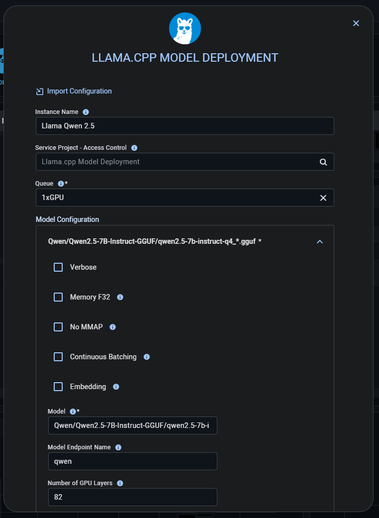 - Project name - ClearML Project where your llama.cpp Model Deployment app instance will be stored
