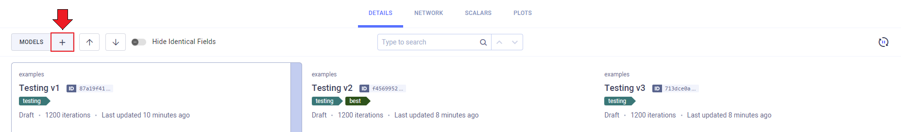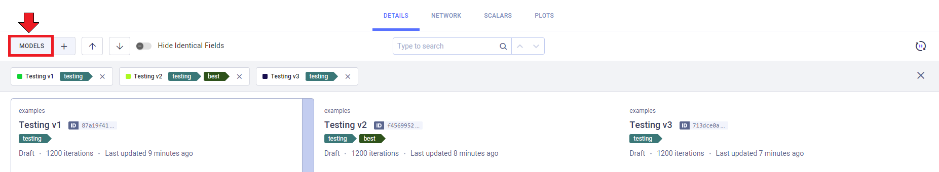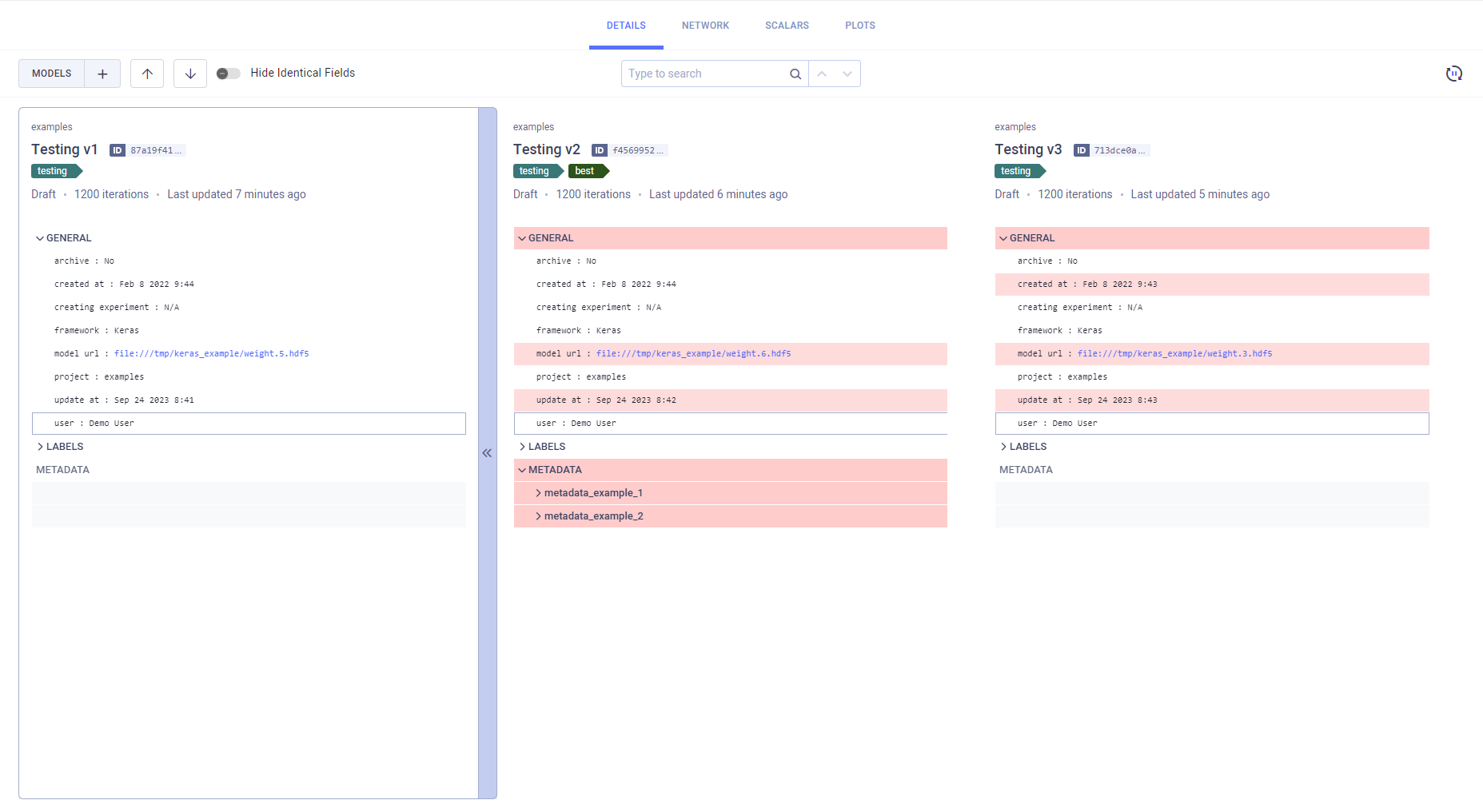 In the Details and Network tabs, you can view differences in the models' nominal values. Details displays the models' general information, labels, metadata, and lineage. Network displays the models' configuration. Each model's information is displayed in a column, so each field is lined up side-by-side.