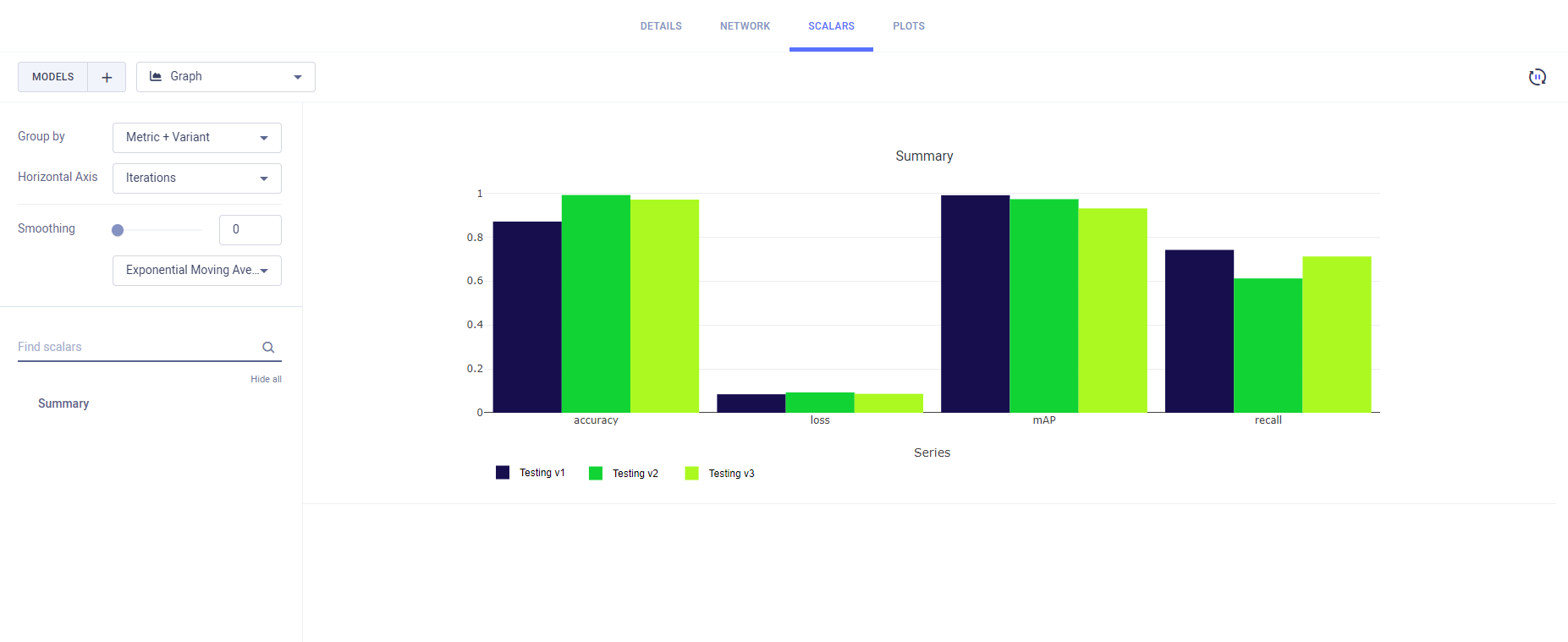All single value scalars are plotted into a single clustered bar chart under the "Summary" title, where each cluster represents a reported metric, and each bar in the cluster represents a model.