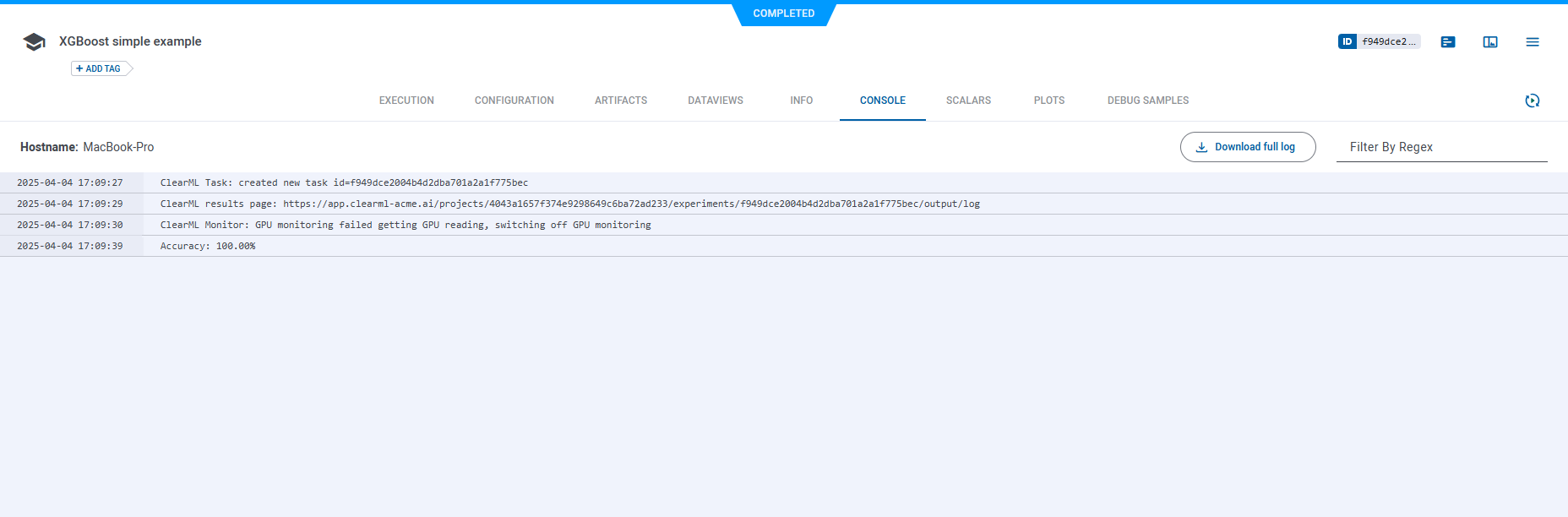 Models created by the task appear in the task's ARTIFACTS tab. ClearML automatically logs and tracks models and any snapshots created using XGBoost.