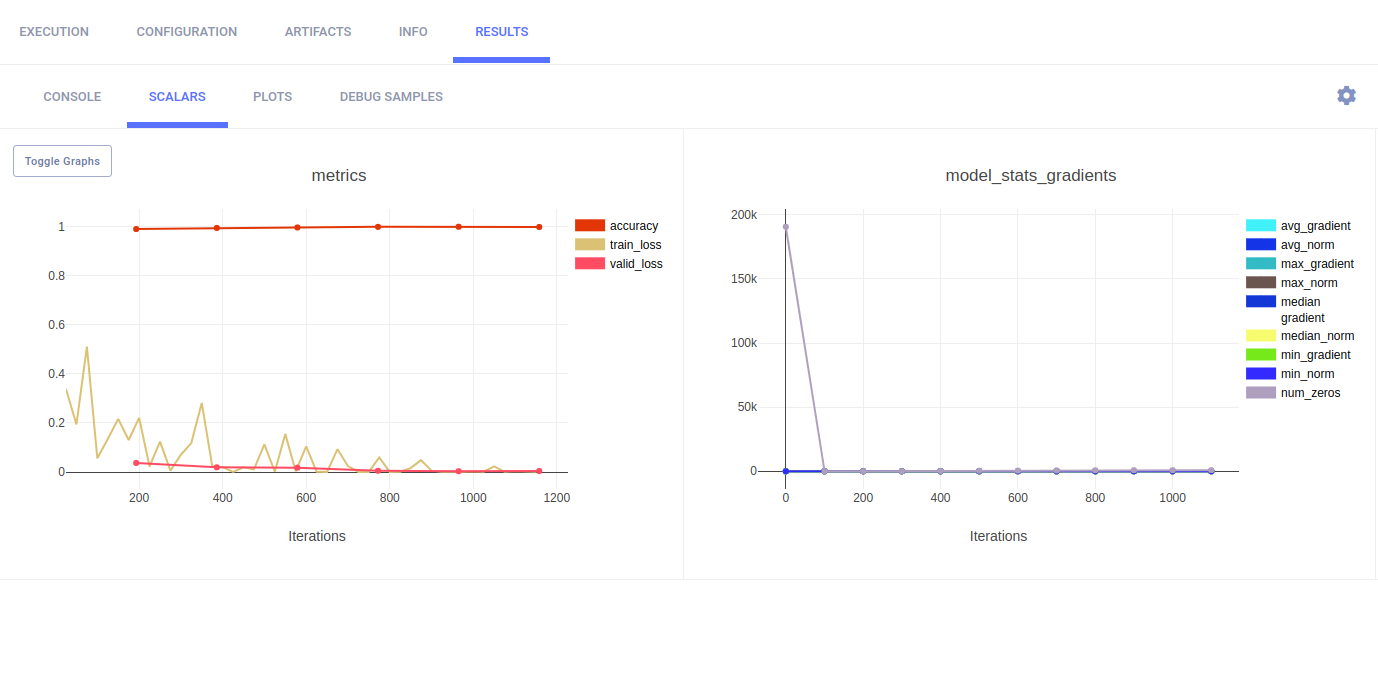 The fastai_with_tensorboard_example.py example demonstrates the integration of ClearML into code that uses FastAI v1 and TensorBoard.