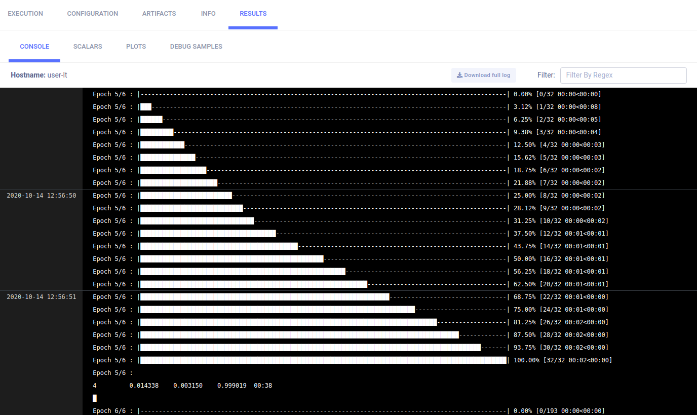 Text printed to the console for training progress, as well as all other console output, appear in RESULTS > CONSOLE.