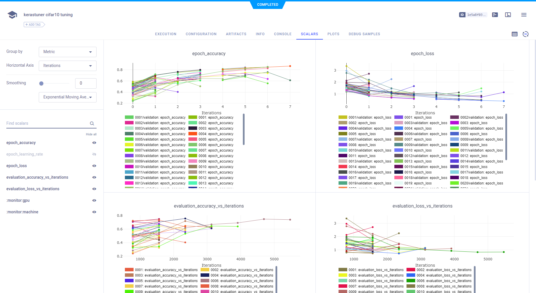 Integrate ClearML into code that uses Keras Tuner. By specifying ClearMLTunerLogger (see kerastuner.py) as the Keras Tuner logger, ClearML automatically logs scalars and hyperparameter optimization.