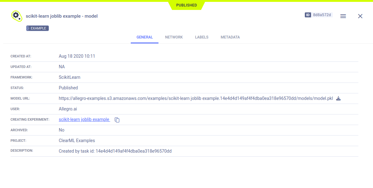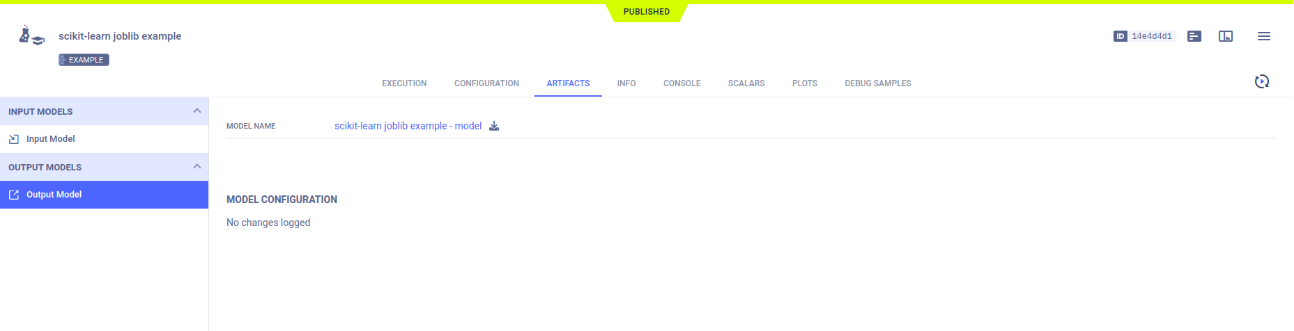 Models created by the experiment appear in the experiment’s ARTIFACTS tab.