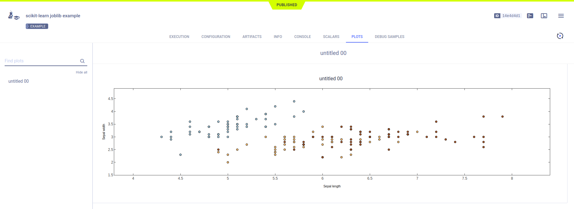 ClearML automatically logs the scatter plot, which appears in the experiment's page in the ClearML web UI, under PLOTS.
